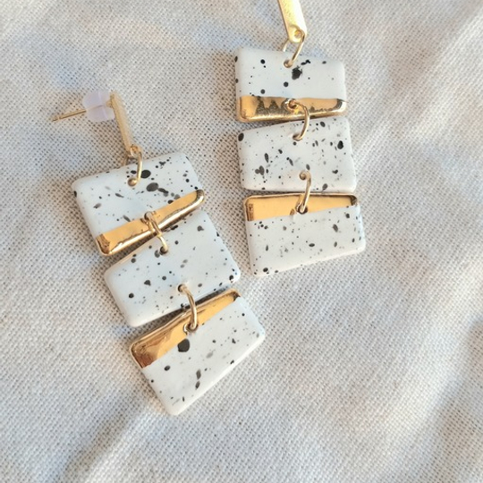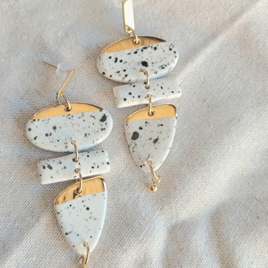 Ceramic earrings with touches of gold lustre,made from multiple pieces of ceramics and gold-plated stainless-steel pieces of per earring. 2 week to manufacture and deliver.