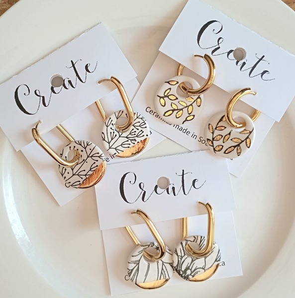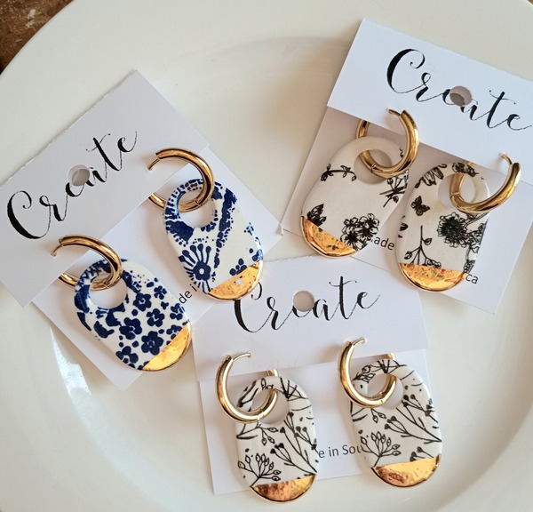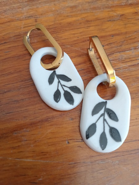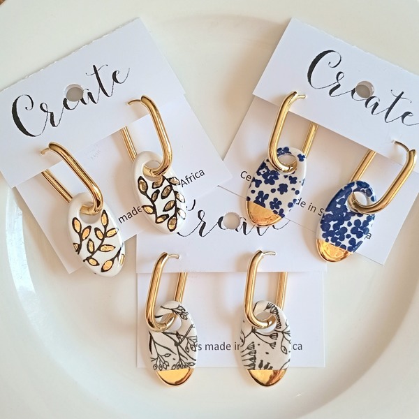 Handmade and hand painted round, Large Oval and Small Oval ceramic Dangle Earrings. Available in White, Black, Green and Blue Ceramic pieces. Huggie is made of Gold-plated stainless steel. Please allow 2 weeks for manufacturing and delivery.