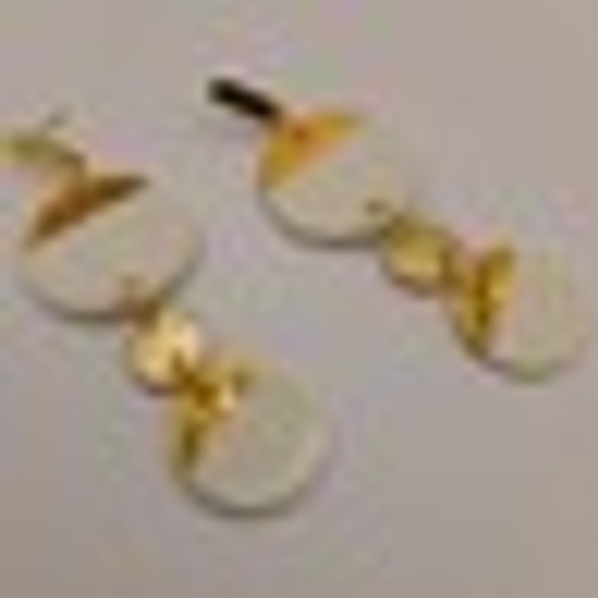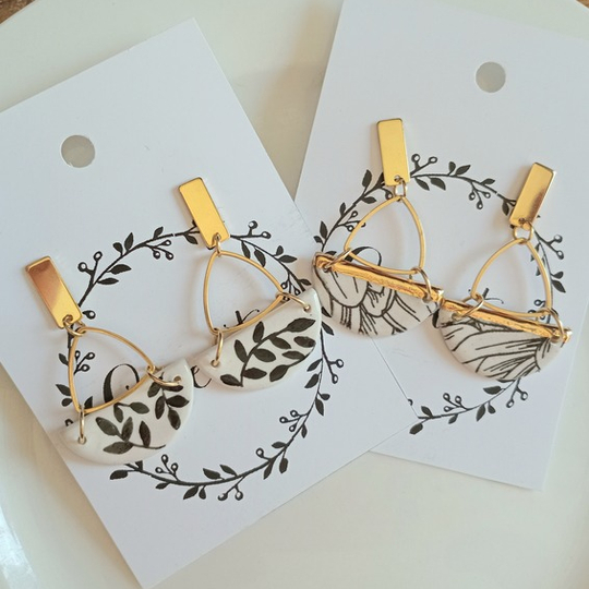 Handmade and hand painted White ceramic jewelry including studs, dangle earrings and pendants on a 45cm chain, with touches of gold lustre. All findings used is 100% gold-plated stainless-steel. Allow 2 weeks for manufacturing and delivery.